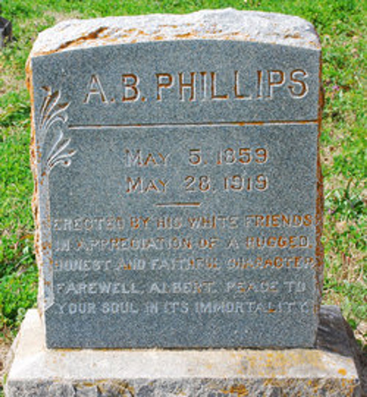 Albert B Phillips: "A. B. Phillips was a man of many talents. He was a champion cowboy roper and worked as a porter at the chambers of the Texas Supreme Court. His mother, Annie Walton, was a slave and she is buried near him in Bethany. His wife was named Emmaline.". His father, a white man brought A.B a piece of land on New York Avenue. He was held in high esteem and said to be a credit to his race. Supreme Court Judge Will Hart did the Eulogy for his Funeral. His headstone reads; Erected by his white friends in appreciation of a rugged, honest, and faithful character.