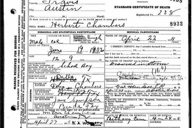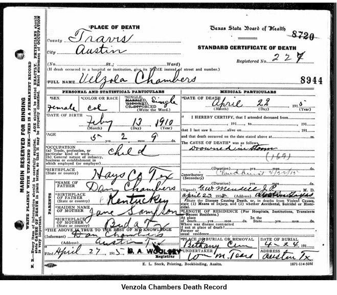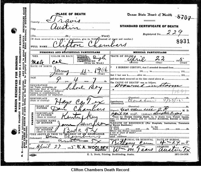 Dan and Jane Chambers lost all 5 of their children in the flood of 1915. While the couple attended a church event, the flood swept away their house and children. Three of their children Hubert, Venzola, and Clifton were found dead. Despite efforts, two of their children, Leola and Irene, were never found.